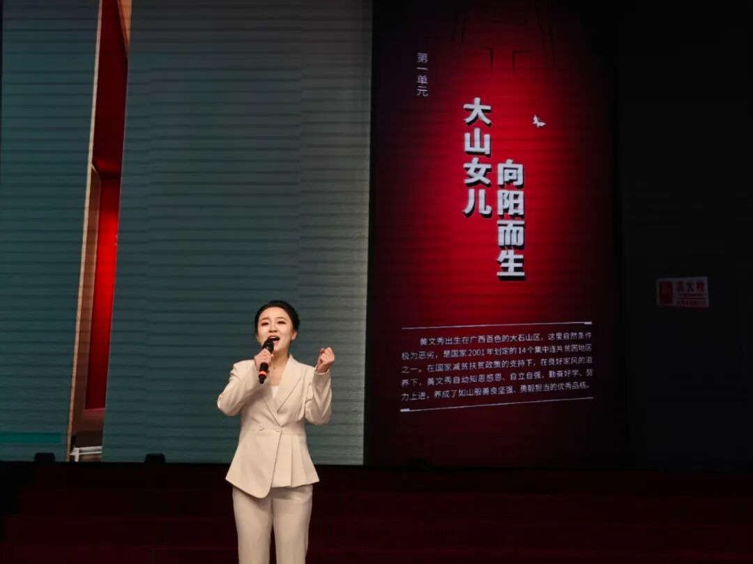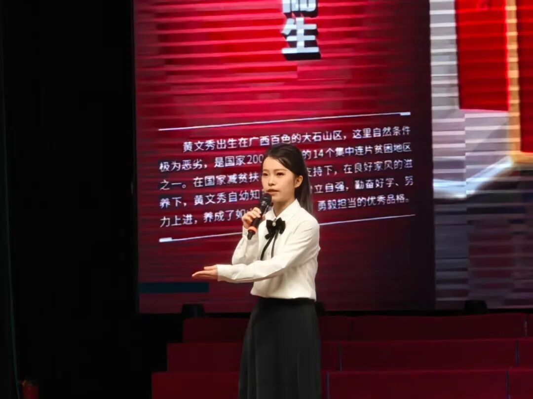 法学 2401 班魏乐怡以《走近文秀,听见大山》为题宣讲。文秀馆是传承黄文秀优秀品质的重要精神坐标,展陈再现了她的成长与扶贫历程。黄文秀从百色大山走出,学成后返乡扶贫,克服诸多困难,带动产业发展、帮助村民脱贫,却在山洪中不幸牺牲。她是新时代青年榜样,诠释了奉献与担当。作为青年,应传承其精神,以青春奋斗助力民族复兴,书写无愧于时代的芳华。