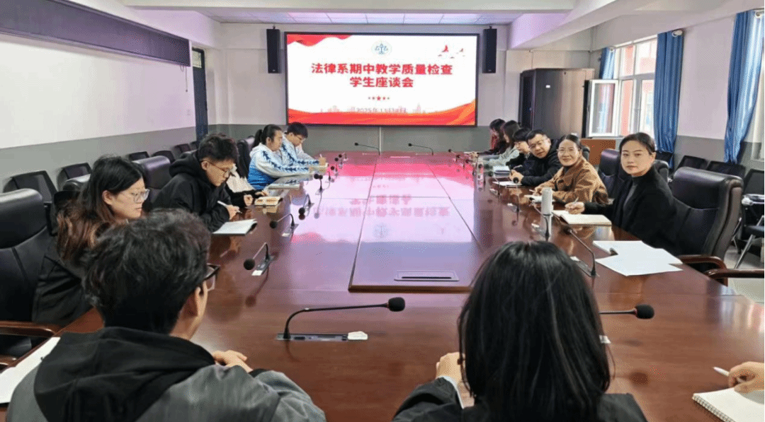 2025年11月4日,法律系在立法咨询基地召开2025-2026学年第一学期期中教学质量检查学生座谈会,法律系党委书记吴海霞、党委副书记王倩、系副主任叶金方、裴宝莉出席,各年级学生代表参加。