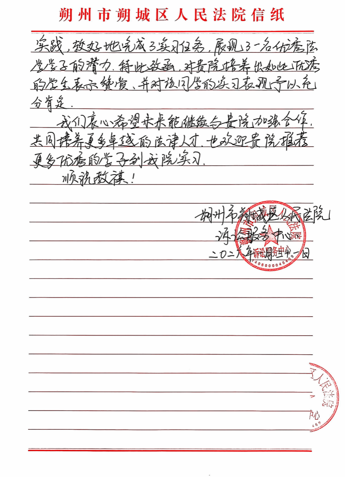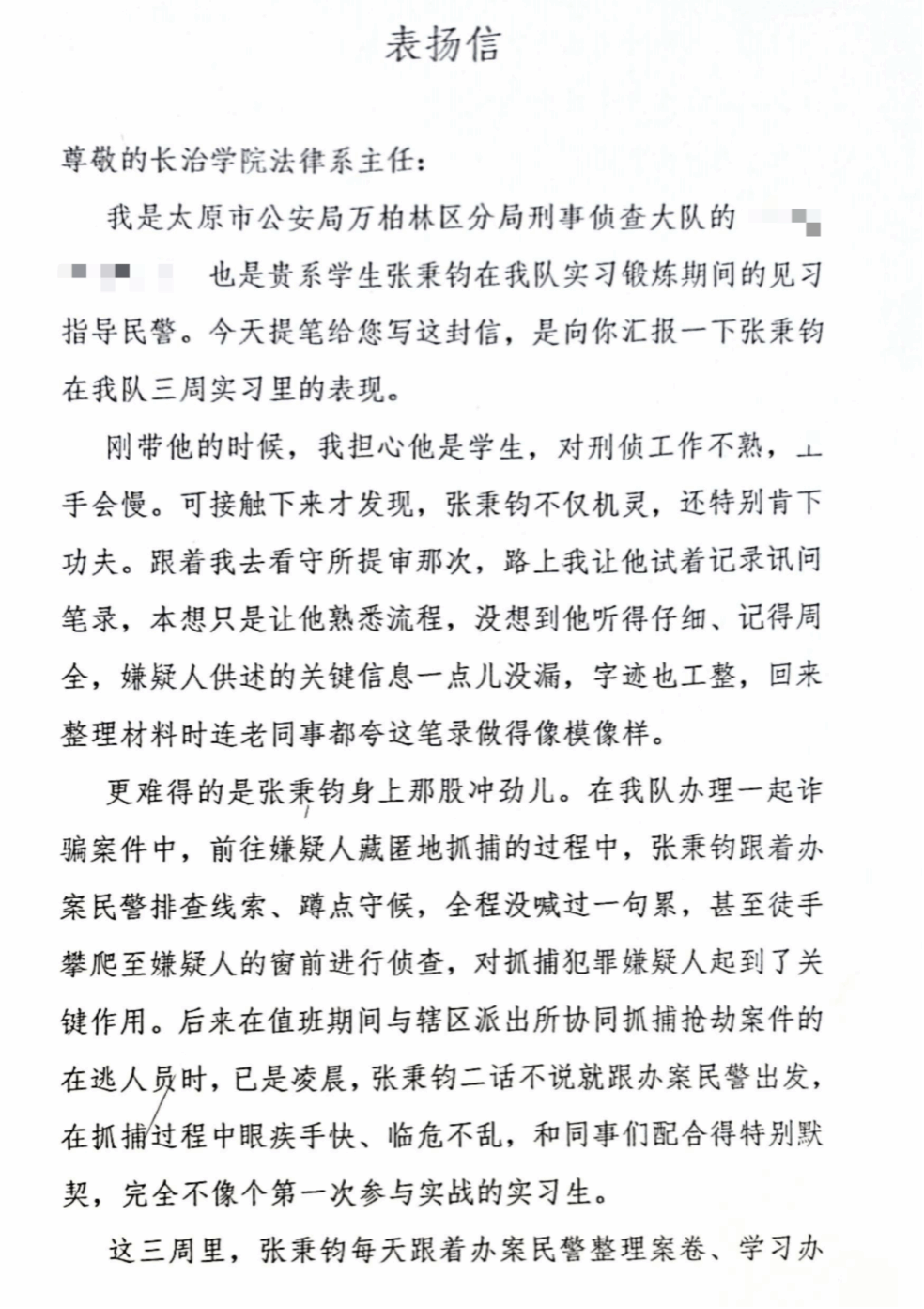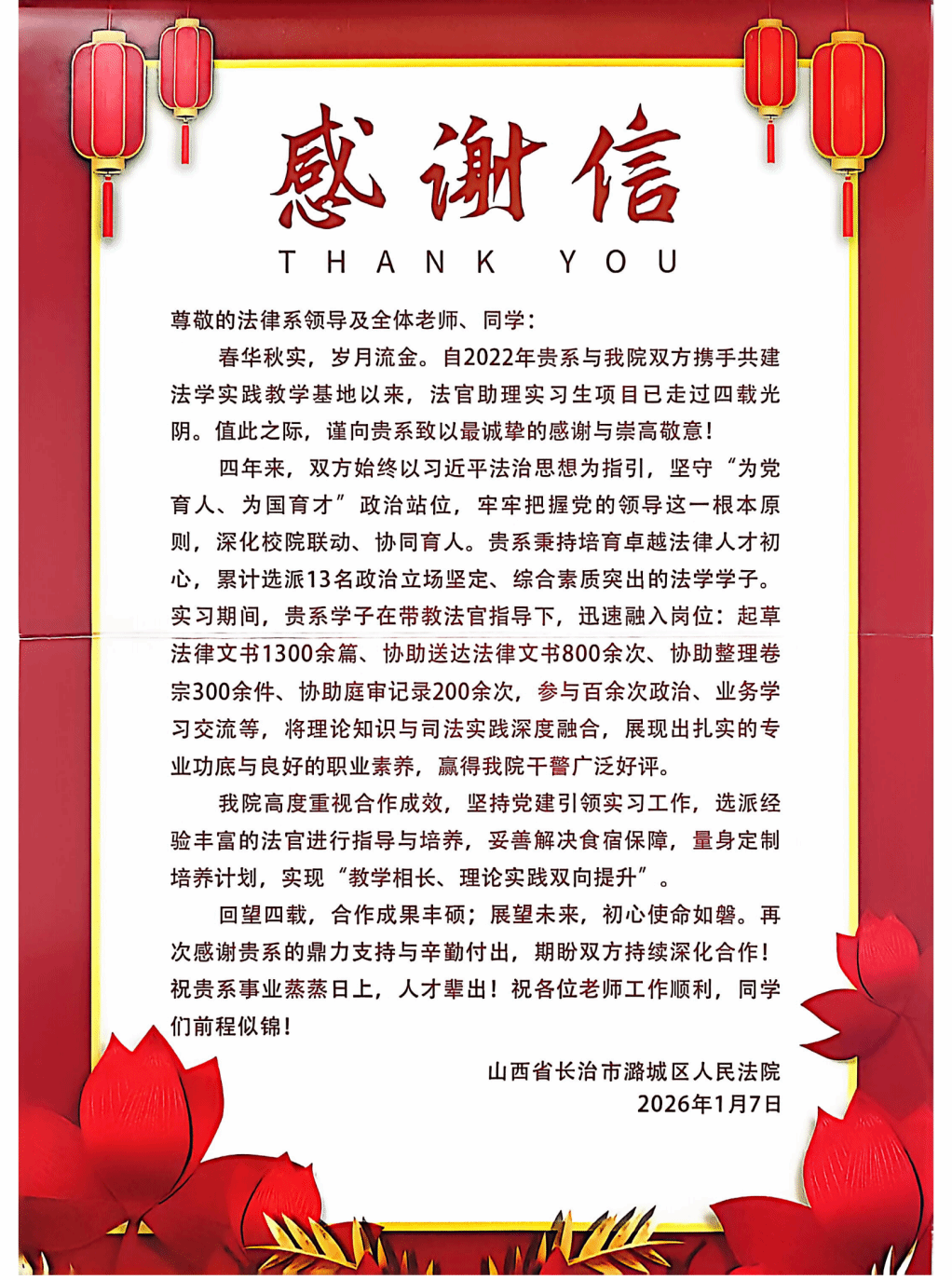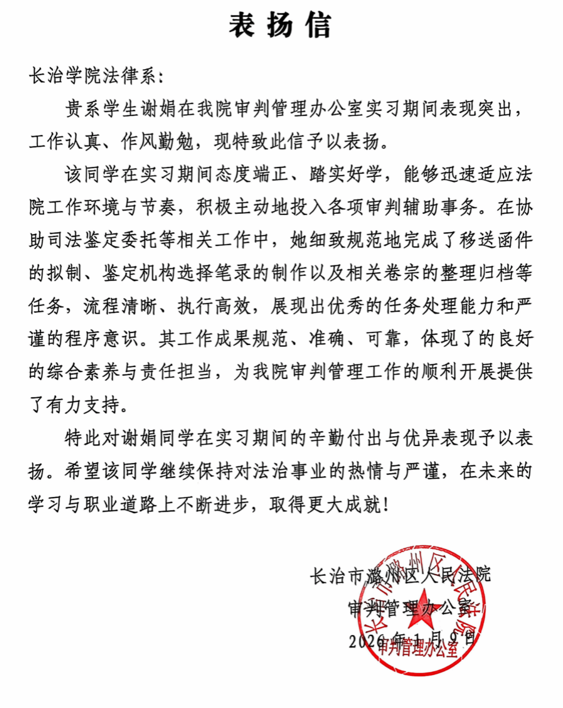 近日,我系接连收到长治市潞城区人民法院、长治市潞州区人民法院、朔州市朔城区人民法院以及太原市公安局万柏林区分局发来的感谢信与表扬信,信中对法律系实习、见习学子的专业素养、工作表现予以高度肯定,同时也对双方进一步深化校地、校院协同育人合作表达了殷切期盼。