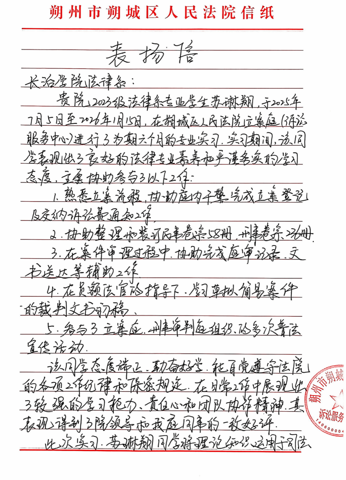 法学2301班苏琳翔同学在新开辟的朔州市朔城区人民法院实习单位进行实习,协助完成立案登记、案卷整理装订、文书送达等多项工作,特别是在带教法官指导下草拟简易案件裁判文书初稿多篇,并积极参与普法宣传活动,实习单位高度认可法官助理实习项目,其本人的学习态度、团队协作精神和实践能力也得到了法院的充分肯定。