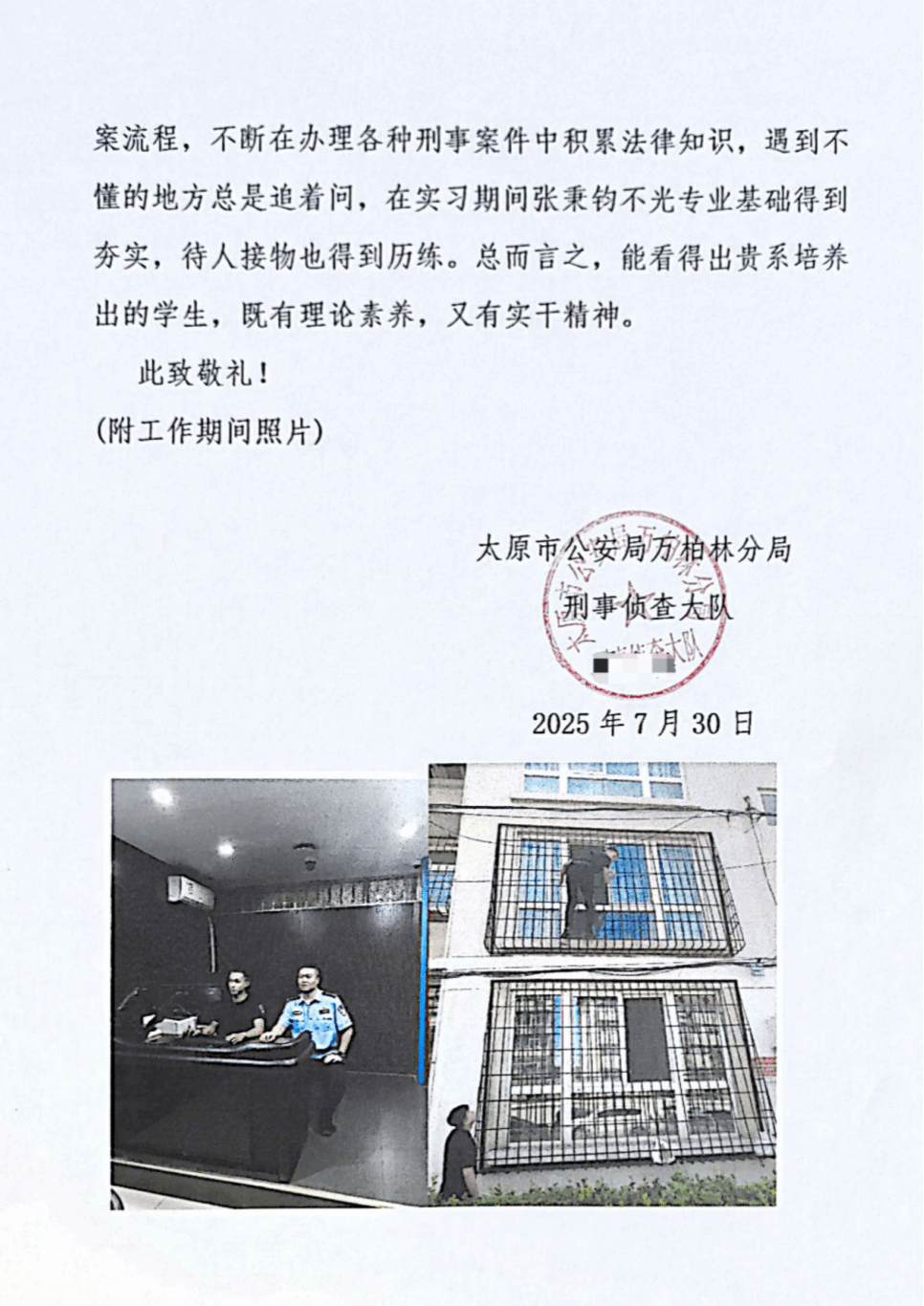 在见习岗位上,我系学子更是以个人的优秀表现展现了人才培养的扎实成效。法学2401班张秉钧在太原市公安局万柏林区分局刑事侦查大队三周的见习锻炼中,打破了指导民警对在校学生的固有印象,在实战工作中展现出不怕苦、不怕累的冲劲,与办案民警配合默契,凭借出色的实干精神和快速的学习能力,获得了指导民警和大队同事的一致称赞。